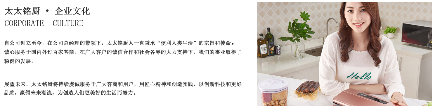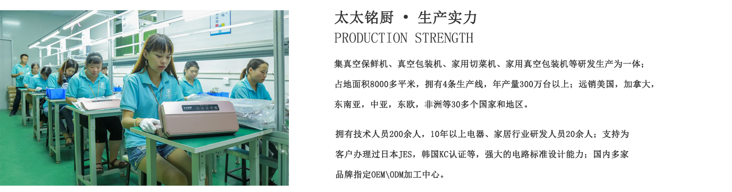 太太銘廚是廣東恒晟控股集團(tuán)旗下家電品牌,是一家集研發(fā)、生產(chǎn)、銷售于一體的綜合性企業(yè)。工廠位于東莞市常平鎮(zhèn),廠房面積8000多平方米, 現(xiàn)有職工200多人,專業(yè)技術(shù)人員23人。專注于研發(fā)、制造家用真空包裝機(jī),切菜機(jī)等廚房智能電器,為全球品牌家電廠家OEM及定制服務(wù),為廚房家電用戶提供更好產(chǎn)品。產(chǎn)品遠(yuǎn)銷銷售于歐美、巴西、日本、俄羅斯及東南亞等國家地區(qū)。